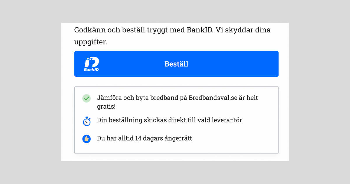 På Bredbandsval arbetar vi varje dag med att du som användare ska känna dig trygg med att beställa bredband och TV via oss. Som ett led i detta har vi redan implementerat stöd för signering med BankID i samband med beställningar av mobilt bredband. Detta då mobilt bredband, till skillnad från fast bredband, inte är kopplat till en specifik adress vilket ökar risken för bedrägeri. Vitsen med att beställa fast bredband till någon annan är inte så stor för en bedragare om de inte kan utnyttja tjänsten.